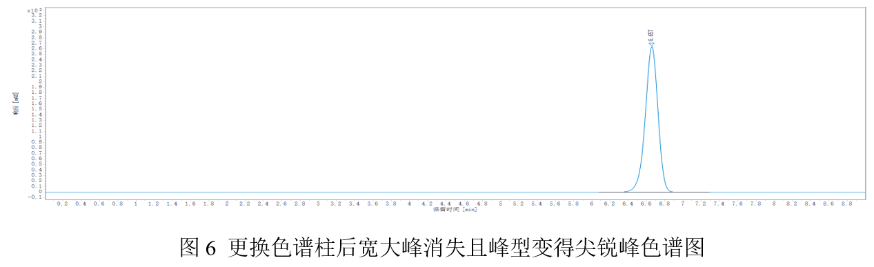1、色譜柱污染或失效,造成塔板數(shù)降低:更換同樣類型的色譜柱,如果新柱子可以提供對(duì)稱的色譜峰,則用強(qiáng)溶劑沖洗舊柱子。色譜柱污染導(dǎo)致峰寬變寬且變形峰色譜圖見(jiàn)圖5,更換色譜柱后寬大峰消失且峰型變得尖銳峰色譜圖見(jiàn)圖6。