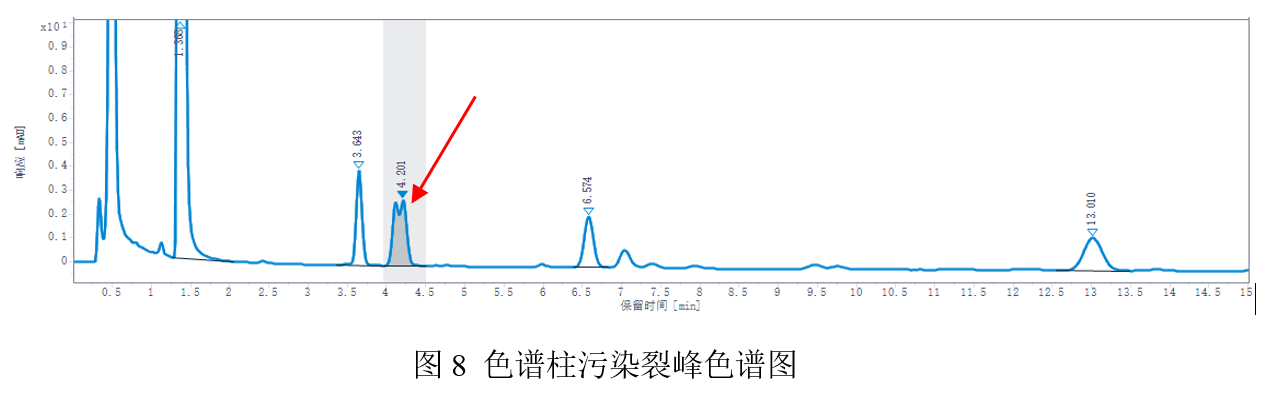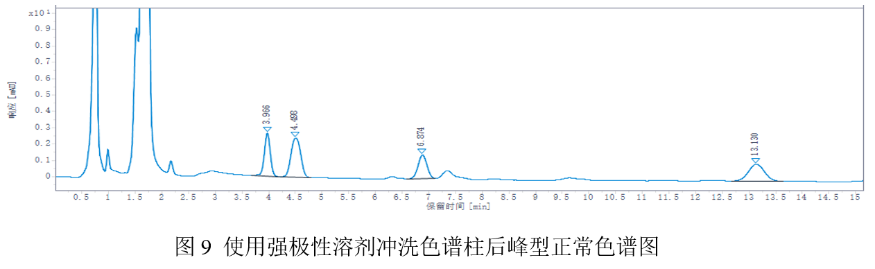 1、樣品復(fù)雜:樣品基質(zhì)復(fù)雜或分析多種樣品,導(dǎo)致柱污染或部分阻塞濾片。通常使用保護(hù)柱,如有必要,在進(jìn)樣之間或在分析過(guò)程中,定期用強(qiáng)溶劑沖洗柱子。色譜柱污染裂峰色譜圖見(jiàn)圖8,使用強(qiáng)極性溶劑沖洗色譜柱后峰型正常色譜圖見(jiàn)圖9。