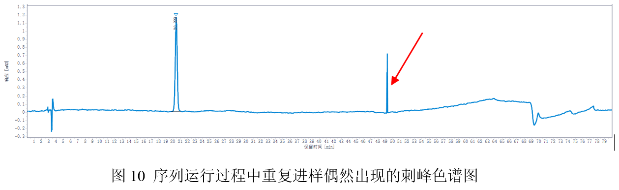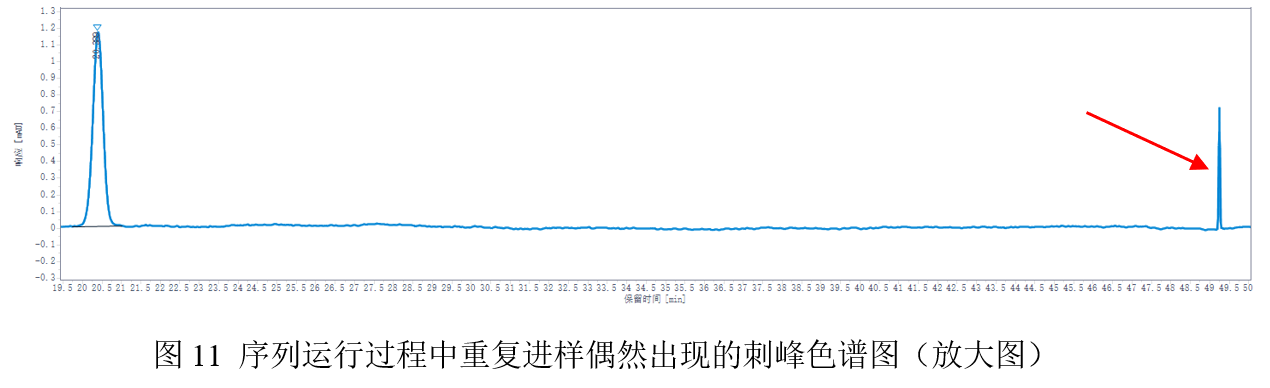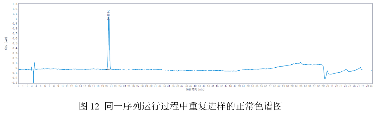 對(duì)于偶然出現(xiàn)的刺峰,可觀察,如不重復(fù)出現(xiàn),可不處理。序列運(yùn)行過(guò)程中重復(fù)進(jìn)樣偶然出現(xiàn)的刺峰色譜圖見(jiàn)圖10、11,同一序列運(yùn)行過(guò)程中重復(fù)進(jìn)樣的正常色譜圖見(jiàn)圖12。