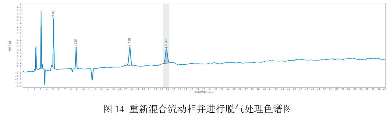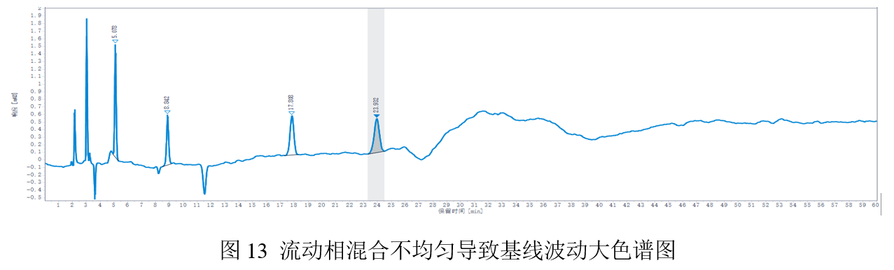 2、流動(dòng)相不均勻:流動(dòng)相條件變化引起的基線漂移大于溫度導(dǎo)致的漂移。使用HPLC級(jí)的溶劑,流動(dòng)相在使用前進(jìn)行脫氣處理。流動(dòng)相混合不均勻?qū)е禄€波動(dòng)大色譜圖見(jiàn)圖13,重新混合流動(dòng)相并進(jìn)行脫氣處理色譜圖見(jiàn)圖14。