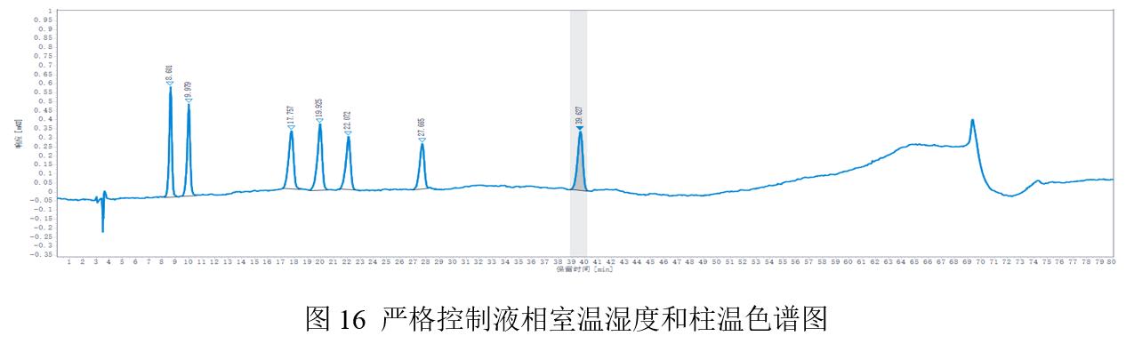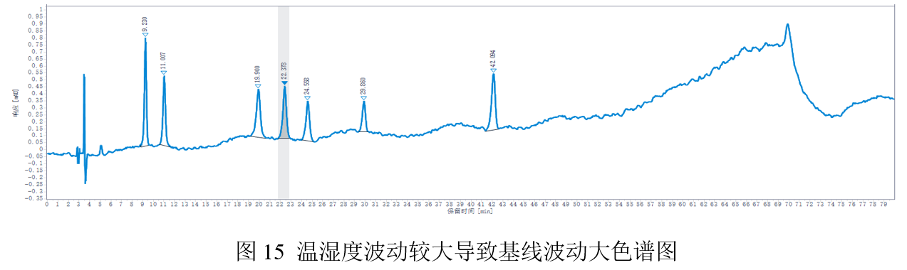 4、溫度影響(柱溫過(guò)高,檢測(cè)器未加熱):使用柱溫箱,減少溫度差異或加上熱交換器。溫濕度波動(dòng)較大導(dǎo)致基線波動(dòng)大色譜圖見(jiàn)圖15,嚴(yán)格控制液相室溫濕度和柱溫色譜圖見(jiàn)圖16。