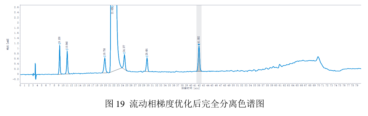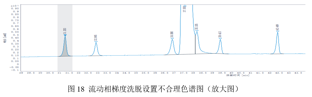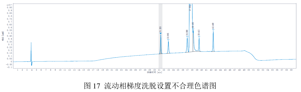 1、流動(dòng)相梯度洗脫設(shè)置不合理:優(yōu)化梯度洗脫程序。流動(dòng)相梯度洗脫設(shè)置不合理色譜圖見(jiàn)圖17、18,流動(dòng)相梯度優(yōu)化后完全分離色譜圖見(jiàn)圖19。